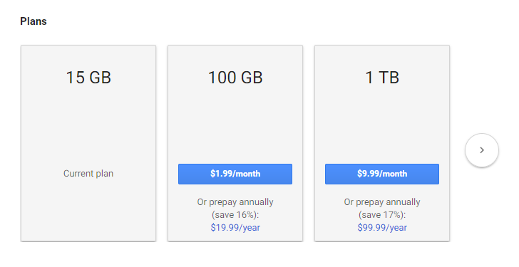 Long have many of us waited for Google to add an annual billing option to Google Drive, and probably mostly because we hoped it would come with a discount. It appears today is the day: Google Drive now has options for yearly subscriptions, saving you 16-17% versus the current monthly scheme. The annual plans are offered only at the 100GB and 1TB tiers, at $19.99 and $99.99, respectively. The 1TB annual plan brings Google Drive back into line with pricing for Dropbox Pro, Drive's main competitor. Google's support page hasn't even been updated with this info yet, so it looks like we managed to catch this right as Google flipped the switch.