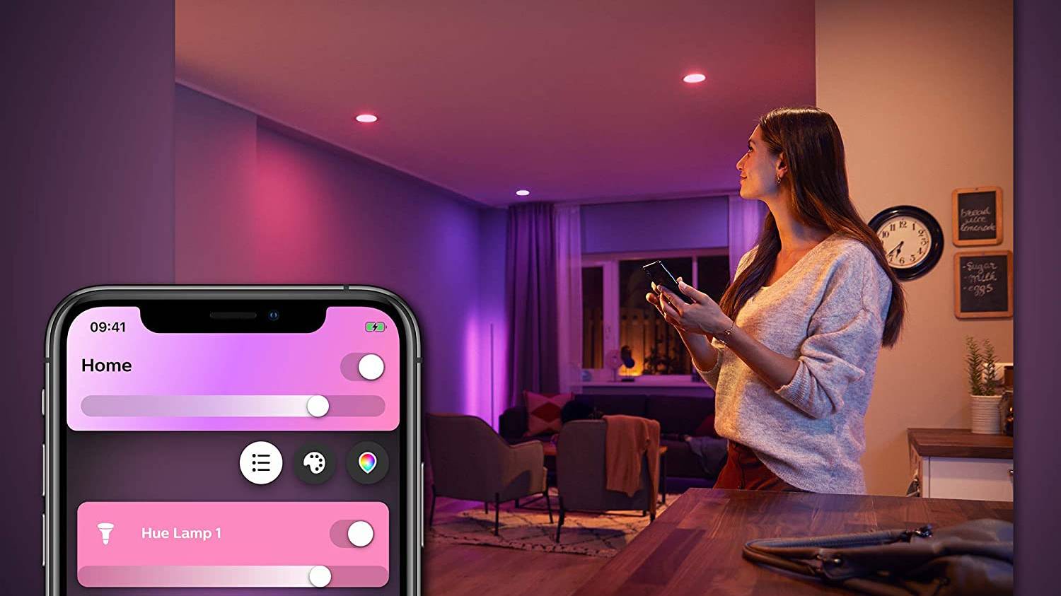 Designed to help you stay productive and feel supported in your overall well-being, Natural light uses different shades of warm-to-cool white light to mimic the sun’s movement throughout the day. Your lights will automatically transition throughout the day: start with bright, cool tones to energise your mornings and end with a warmer, golden glow that helps you relax as the sun goes down.